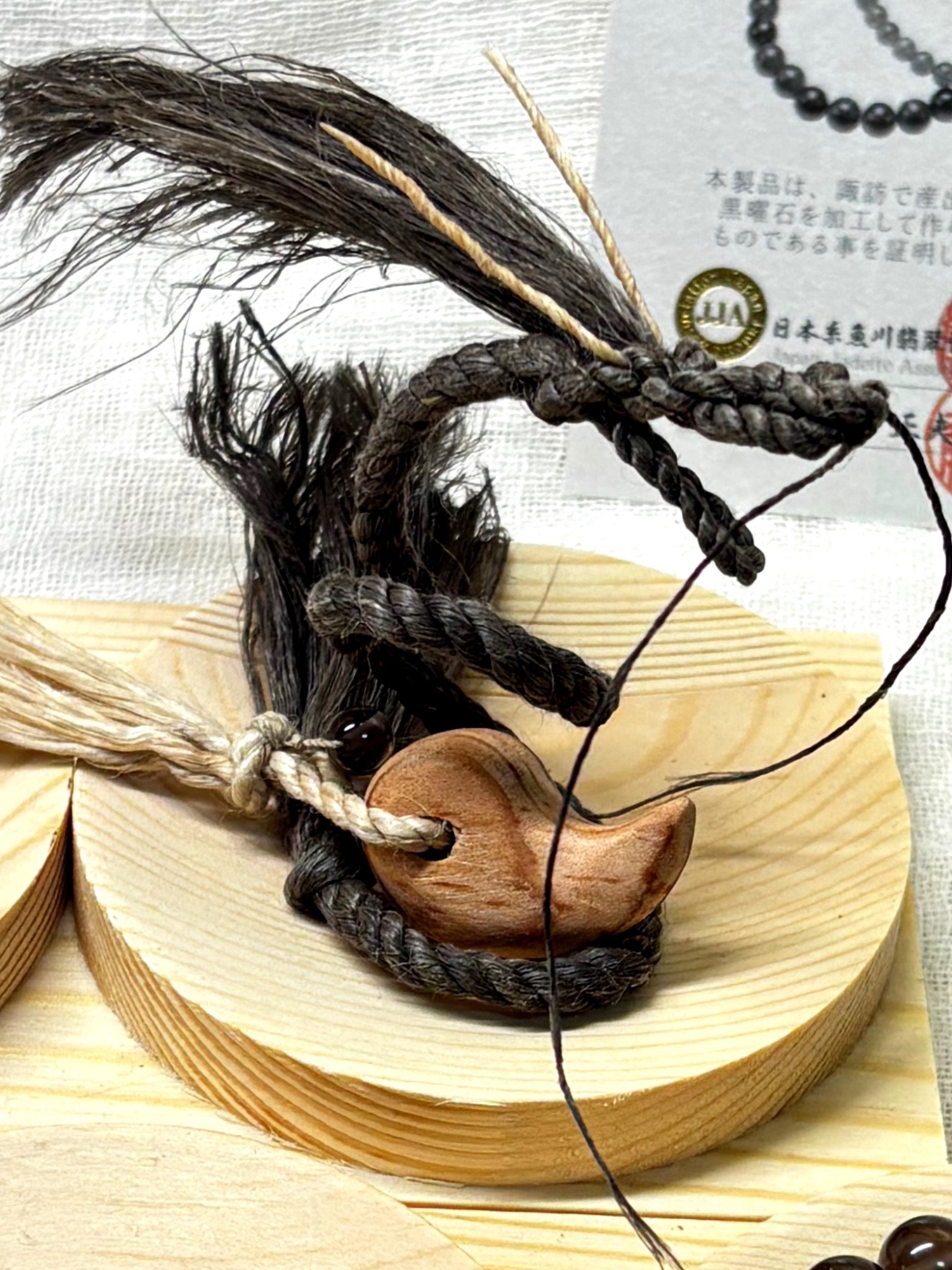 2022 寅年、諏訪で伐採された御柱御用材を加工してつくられた「勾玉」に、聖麻を通し、諏訪黒曜石のビーズをつけ、ミニ龍神注連縄(ベンガラ染め精麻を使用)を台座としました。ミニ龍神注連縄には「靈入れ」れをしてあります。これはまさに諏訪龍神です。
