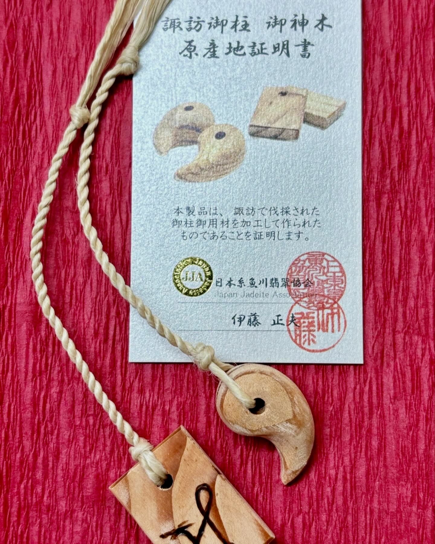 ※勾玉には日本糸魚川翡翠協会発行の「諏訪御柱 御神木 原産地証明書」がつきます。